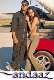 Petite précision, "ANDAAZ" est un mot indien mystérieux pour l’occidental que je suis, il peut se traduire par "allure" ou "style" mais aussi par "estimation" ou "à la louche" voire même par "en gros" (je parle réellement Hindi...). Autant vous dire que la traduction de ce mot varie comme la météo et que je ne sais pas quel temps il faisait le jour où les producteurs ont choisi ce titre. Je vous propose tout de même l’équivalent français suivant : "En gros, il a une allure d’endive, mais il estime qu’il a le style suffisant pour se la jouer difficile avec deux bombasses moulées à la louche". C’est un peu long, ça ne veut rien dire mais c’est pas grave...