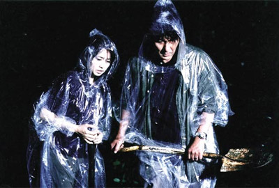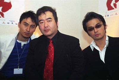 ...dès les premières images le ton est donné ! Le spectateur est pris à partie par une voix. C’est celle de Yûya Uchida [1], instigateur, co-auteur et acteur principal du film. Seul à l’écran, son visage en gros plan nous fait face. Tandis que des mains féminines lui coupent les cheveux, il explique en off, non sans un certain cynisme à peine dissimulé, que ce KZNI ! est le fruit un peu particulier et improbable, né de l’esprit critique et acerbe de trois hommes. Yûya Uchida, figure emblématique de la scène rock nippone et grande gueule notoire, s’attelle à l’écriture du script avec l’aide d’Isao Takagi, célèbre scénariste de films pornographiques et d’un roman poruno de la Nikkatsu qui mêle sexe et SF, Time Abanchiûru Zekkou 5 Byou Mae... bref, deux hommes faits pour se rencontrer. Le scénario écrit, encore fallait-il trouver un homme capable, mais surtout qui ose réaliser ce brûlot atypique. Un seul, "suffisamment dingue" selon Uchida, accepte. Yôjirô Takita, "pornographe" qui officie alors depuis 1978 dans l’industrie du X nippon, qui réalise pas moins de vingt-deux oeuvres entre 1981 et 1986, dont la série des Chikan Densha (The Train of Molesters - que de réjouissances ! - produite par la Shin Toho) - onze épisodes - dont la fixation sur les parties charnues des actrices est l’un des attraits principaux (Rumiko no Oshiri, Momoe no Oshiri, Seiko no Oshiri, etc... [2]), et, plus récemment, des films à caractère beaucoup moins sexuel tels Bokura wa Minna Ikiteiru (1993), Ojuken (The Exam /1999), et les fameux Himitsu (Secret /1999) et Onmyouji (2001)... Uchida assène le public d’un dernier : "(...) pour des raisons de sécurité il vous est interdit de faire l’amour dans cette salle (...)". Il n’y a rien à ajouter, le film peut commencer...
