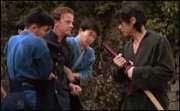 Premier atout, la présence Yoshio Harada (récemment dans Azumi, Kyouki no sakura, et incroyable Captain Banana dans Party 7), accompagné de la ravissante Yôko Shimada (Lady Hanada dans Crying Freeman), dans ce que l’on pourrait appeler le syndrome The Last Samouraï. A l’instar de Ken Watanabe, Harada bouffe littéralement l’écran à chacune de ses apparitions et son charisme éclipse sans mal ses autres partenaires. Second atout, une séquence bien barrée qui justifie à elle seule le visionnage du film (je vous assure). A ma gauche Yoshio Harada, costume cravate, sabre à la main. A ma droite une bande de ninjas surarmée. Le lieu de l’affrontement : le Shinkansen. Nos tueurs impitoyables ne laissant aucun témoin, ils commencent par liquider tous les voyageurs qu’ils croisent sur leur chemin. Surgit Harada, très calme, très pro. Deux, trois coup de sabre plus tard, un ninja vide ses tripes sur le sol. Fin du premier round, Harada repart tranquillement dans un autre wagon, à la stupéfaction des ninjas restant.. S’ensuit une bonne tuerie dans les règles de l’art, avec coups de sabre capable de trancher l’acier, quelques flèches de Yôko Shimada, et de bonnes giclées de sang.