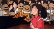 De l’autre côté, la petite famille découvre une ville qui ressemble un peu à un parc d’attraction abandonné ; pas une âme ne vient perturber l’alignement régulier des ruelles. Tandis que ses parents se laissent grossièrement aller à piller un étalage alléchant de nourritures plus ou moins connues de l’homme, Chihiro pousse un peu plus loin son exploration des lieux, et franchit le pont qui la sépare d’une immense battisse de plusieurs étages, ancienne maison de bains. Rapidement, l’obscurité tombe, et l’endroit se peuple de créatures en tous genres ; multitude d’apparitions bariolées, sympathiques pour certaines et effrayantes pour d’autres. Mais ce n’est pas le seul changement : les parents de Chihiro eux-mêmes sont touchés par l’obscurité et se retrouvent transformés en cochons énormes et répugnants, continuant à se bâfrer de nourritures exotiques. Pour couronner le tout, Chihiro constate avec effroi qu’elle est en train de disparaître, son opacité laissant la place à une certaine transparence avant d’atteindre l’immatérialité. C’est à cet instant que la petite fille rencontre Haku : celui-ci la force à manger une substance inconnue qui lui rend sa consistance. Il lui livre la clé de sa survie au sein de cette cité qui héberge des divinités avides de détente à l’abri des humains : pour ne pas être transformée en cochon, il lui faut absolument travailler. Commence alors le voyage de Chihiro - renommée Sen (le "mille" de "Mille Brasses" en kanji) par son nouvel entourage - sous la houlette tyrannique d’une harpie hydrocéphale, en compagnie de toutes sortes de créatures, d’esprits et de monstres. Mais comment Chihiro va-t-elle pouvoir rejoindre le monde des vivants en compagnie de ses parents porcins ? Pourquoi cette fâcheuse tendance à oublier son véritable prénom ? Et pourquoi Chihiro se sent-elle donc si proche du lunatique Haku ?
