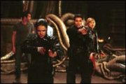 Après deux séquences d’ouverture successives (la "fermeture" de la ruche, les Swats qui envahissent le manoir), Resident Evil continue sur sa lancée ultra-dynamique avec l’entrée dans la Ruche. D’emblée, on ne peut s’empêcher de repenser aux déclarations de certains journalistes à la sortie de Ghosts of Mars, qui qualifiaient l’excellent défouloir de Carpenter de "véritable adaptation du jeu Resident Evil"... et il est vrai que le film d’Anderson nous rappelle souvent le western martien de Carpenter ! Notamment à cause de ces deux scènes en train qui interviennent au début et à la fin de l’histoire, mais aussi à cause du virus, des créatures... et des rôles féminins qui tiennent ici le haut de l’affiche.